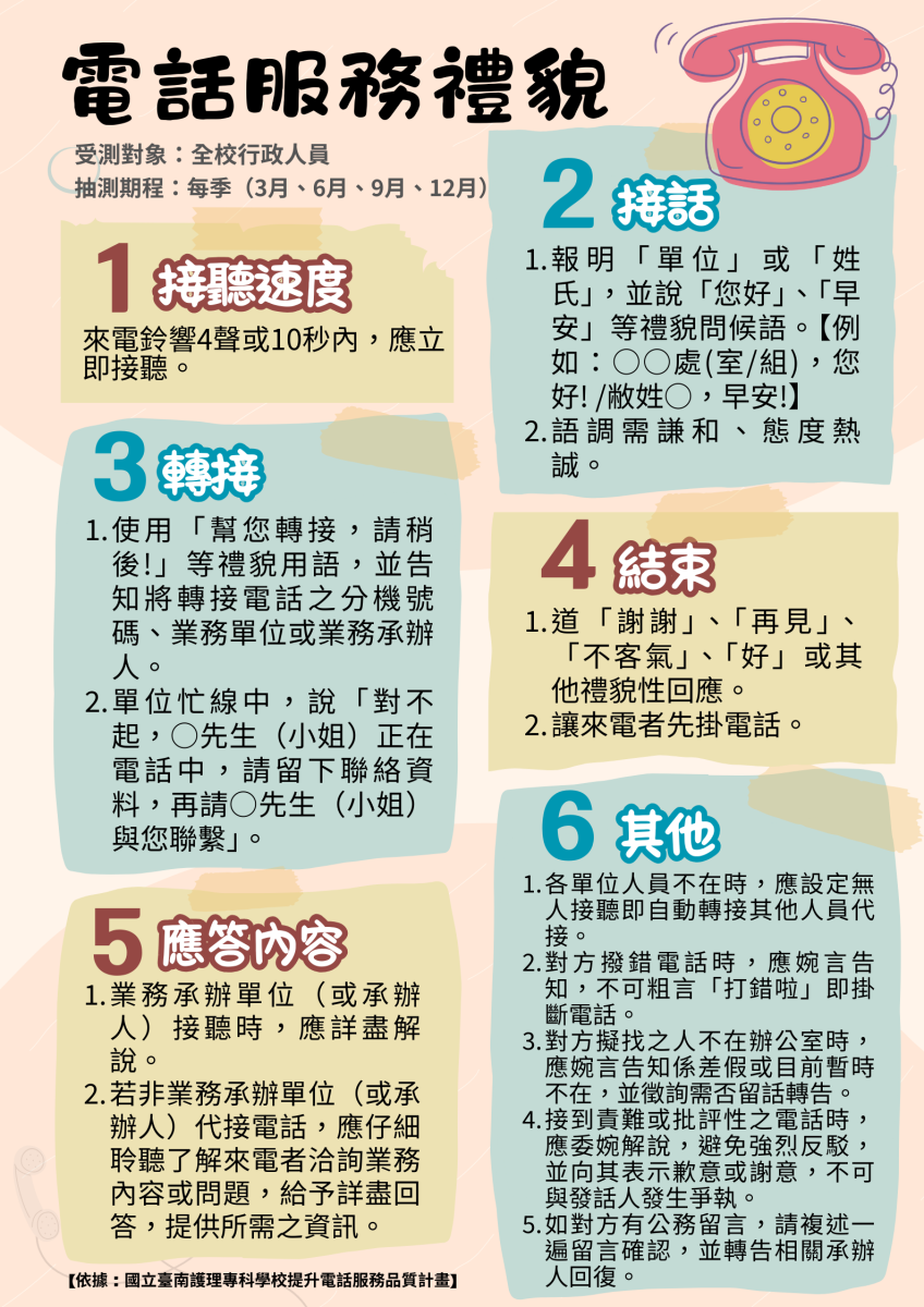 電話服務禮貌專區 114年12月4日校函 國立臺南護理專科學校提升電話服務品質計畫 國立臺南護理專科學校提升電話服務品質測試紀錄表 電話服務禮貌宣導海報 上次更新時間:2025/12/5 上午 11:44:09 瀏覽次數:54