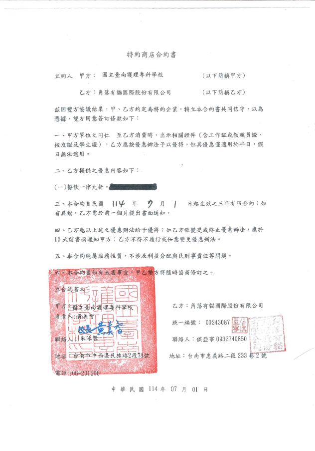 特約廠商 臺南市人上人文教機構(芝麻街美語) 臺南市私立幼寶托嬰中心 角落有貓COFFEE餐飲 榮美/榮興金鬱金香酒店 劍橋連鎖飯店 上次更新時間:2025/12/4 上午 11:12:18 瀏覽次數:7